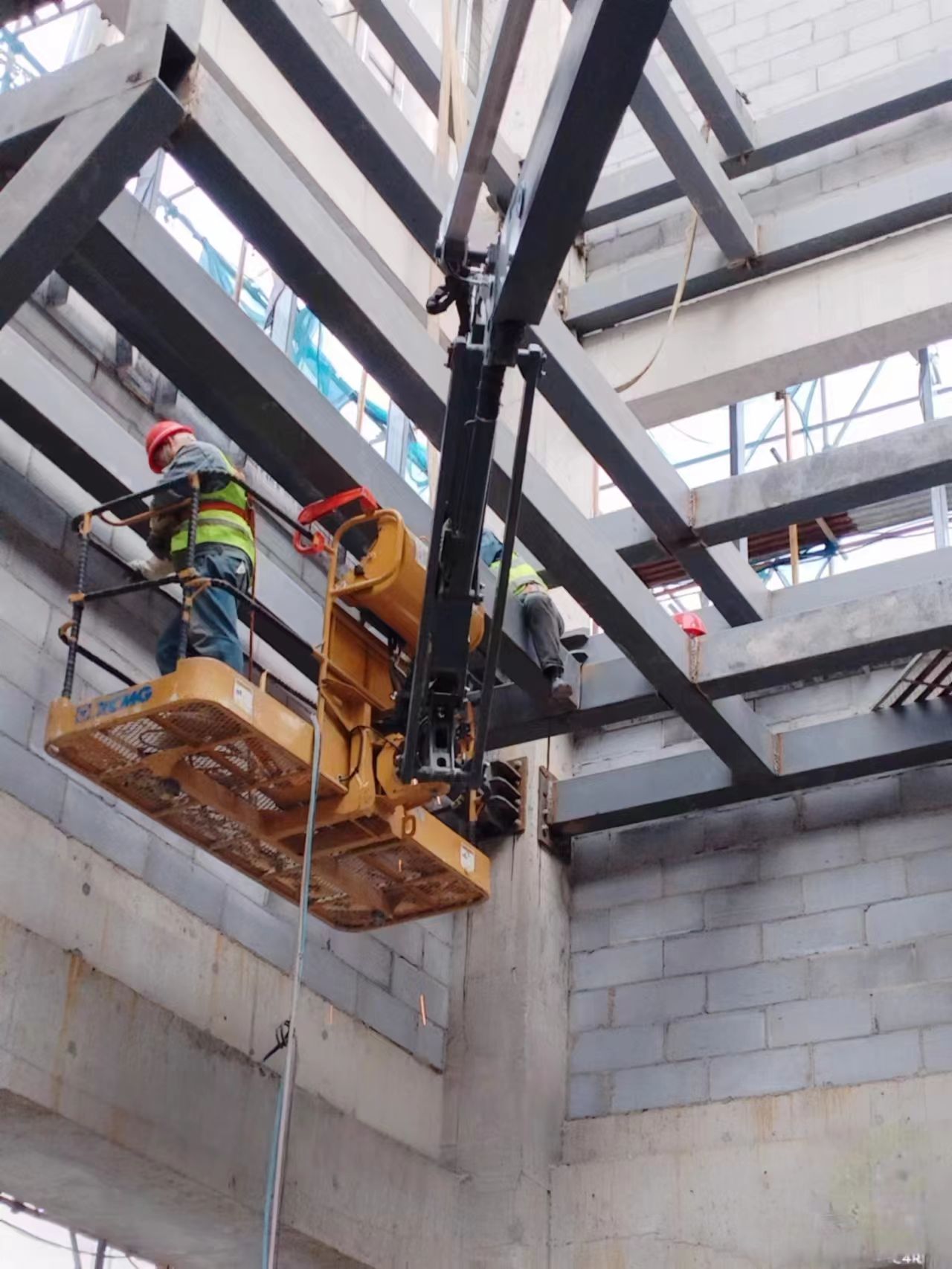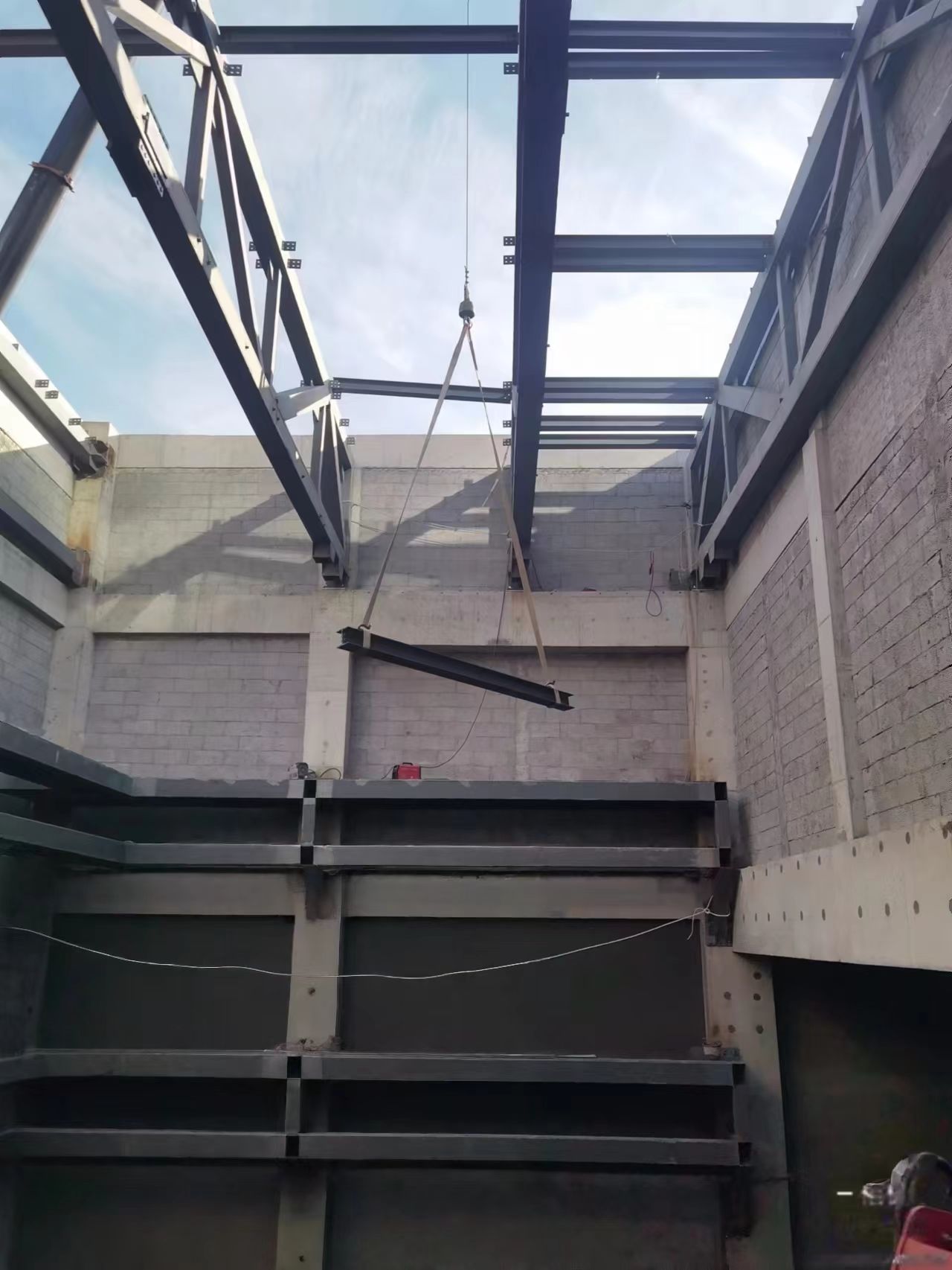 - 构件吊装:使用起重机依次吊装钢柱、钢梁,吊装时采用专用吊具,防止构件变形;就位后及时用临时支撑固定,保证稳定性。